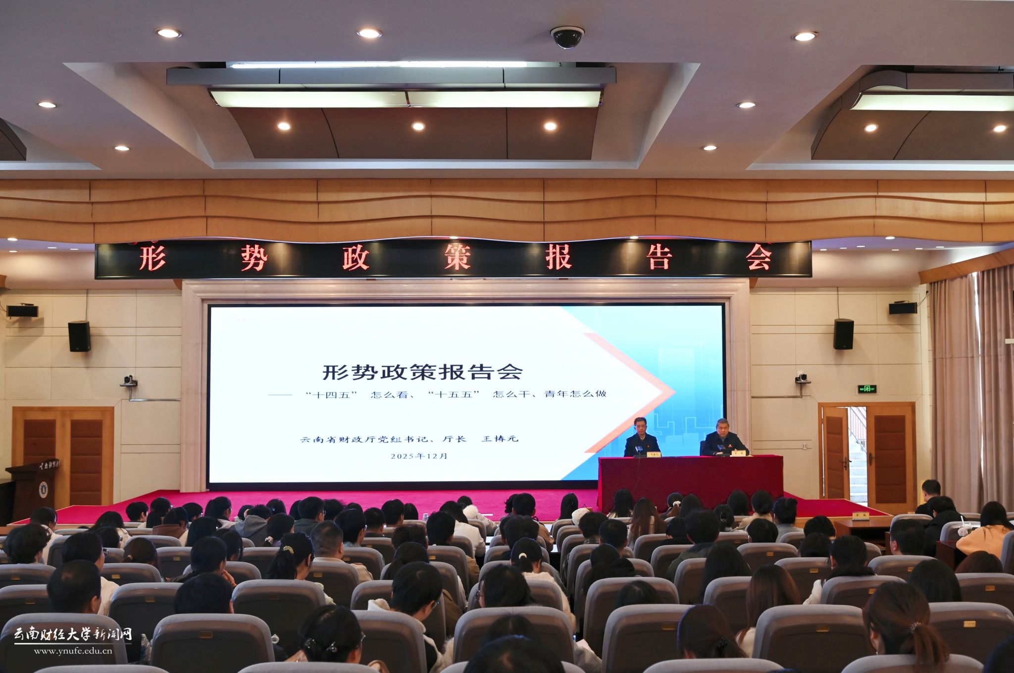 12月1日下午,學(xué)校在國際學(xué)術(shù)報告廳舉辦形勢政策報告會,云南省財政廳黨組書記、廳長王椿元應(yīng)邀作專題報告,校黨委副書記、校長王敏致歡迎辭,校黨委委員、副校長余怒濤主持報告會。