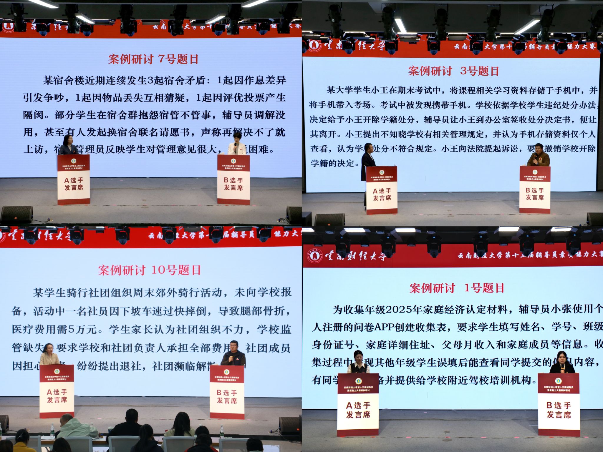 本次比賽分基礎知識測試(閉卷考察)、案例研討、談心談話三個階段。經過前期基礎知識測試選拔,全校96名輔導員中8名晉級決賽。決賽階段重點考察選手的政策把握、案例研判、談心談話和應急處理等能力。