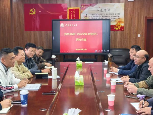 保衛處處長毛瑞紅對廣西大學保衛處一行表示熱烈歡迎,并介紹了學校在安全保衛方面的總體情況。他表示,希望以此為契機進一步加強日常溝通,推動兩校保衛部門在管理機制優化、服務能力提升和管理經驗共享等方面相互借鑒學習、共同提高。