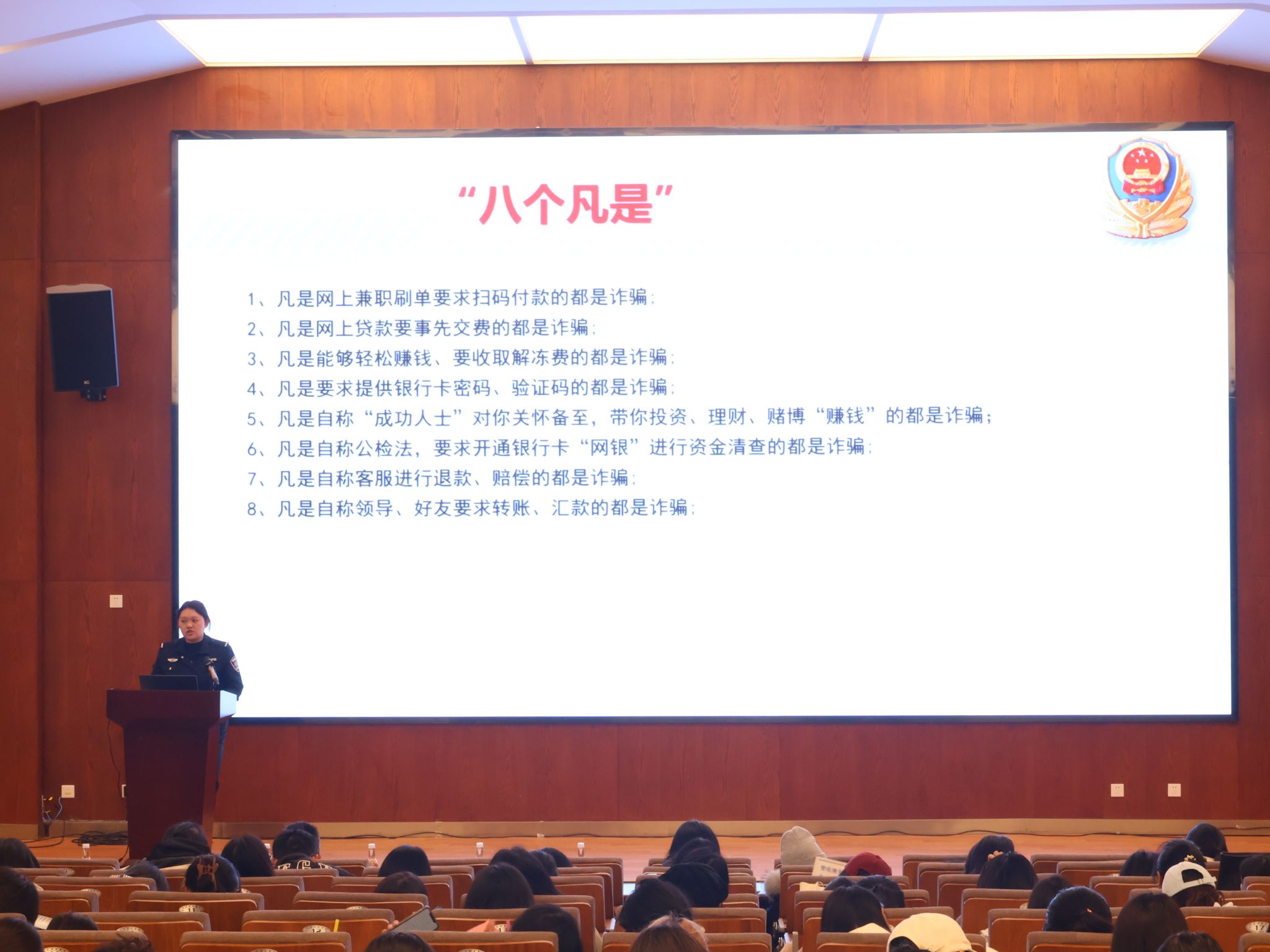 安寧市公安局反詐中心王雯警官系統(tǒng)分析了2025年安寧市電信詐騙案件類型,通過播放宣傳片、現場講解等方式,介紹了常見電信詐騙手段與防范措施,提醒師生不輕信陌生來電和信息,保護好個人信息與銀行賬戶,避免成為“兩卡”犯罪幫兇。
