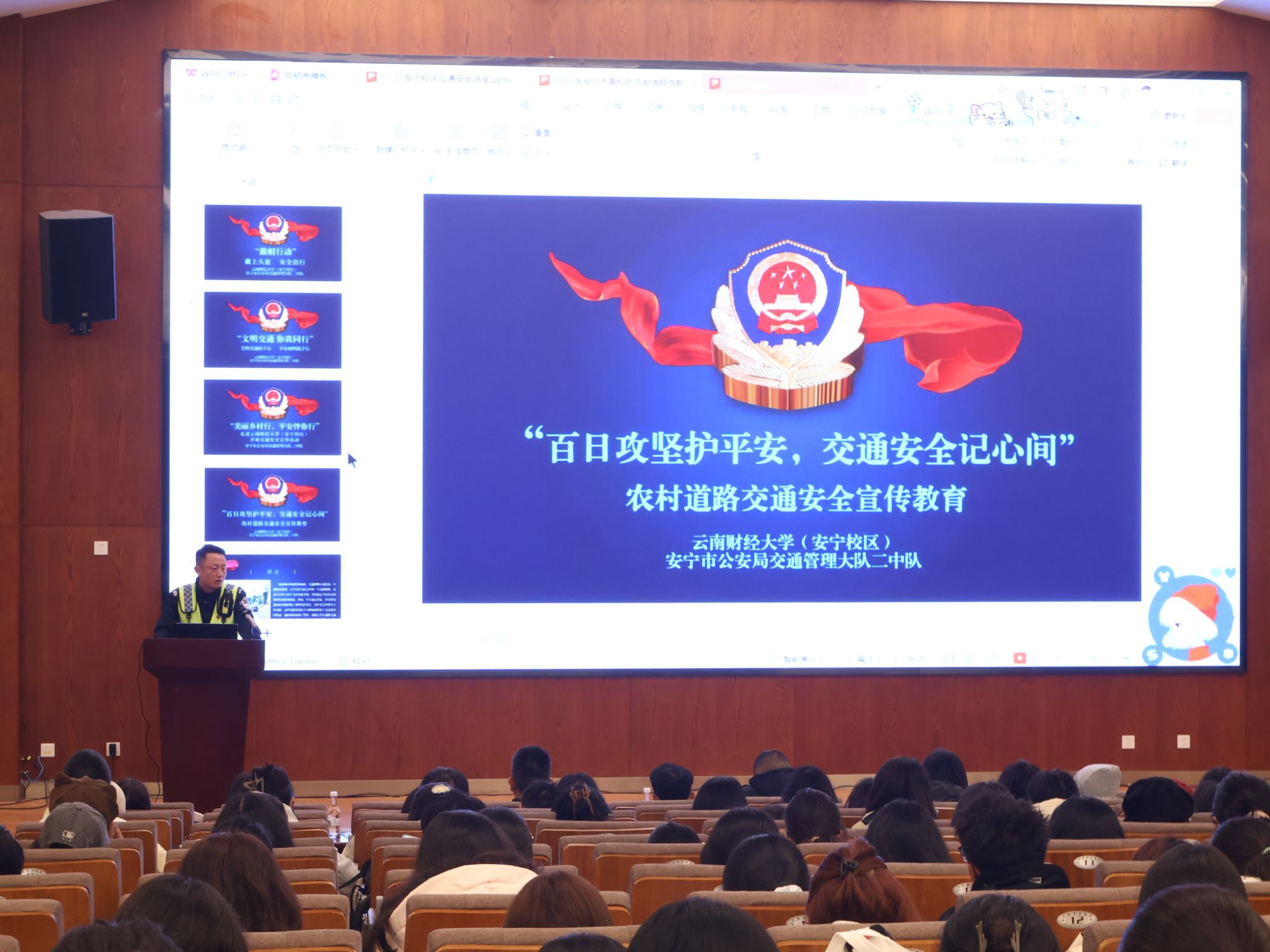 為增強師生安全防范意識,筑牢校園安全防線,11月21日下午,學生處、保衛(wèi)處、校園管理服務中心聯(lián)合安寧市公安局交通管理大隊二中隊、安寧市公安局反詐中心到學校安寧校區(qū)舉辦交通安全和防范電信網絡詐騙知識講座。安寧校區(qū)師生代表及物業(yè)管理人員300余人參加,保衛(wèi)處副處長荊斌主持活動。