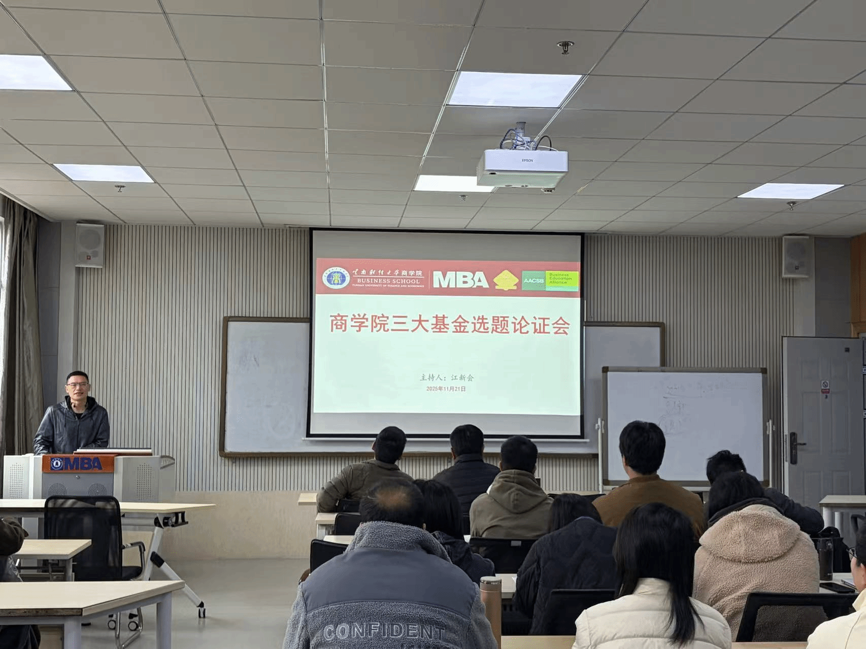 11月21日下午,商學院舉行2026年度三大基金選題第一次集中論證輔導會,邀請昆明理工大學陳渝教授和學院副院長魯平俊教授擔任指導專家,副院長江新會教授主持。
